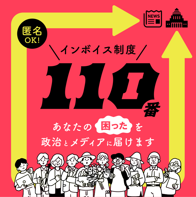 インボイス制度で、「困った」「厳しい」「辛い」思いをしている皆さんの「声」を聞かせて下さい。会社員の方、学生の方などなど、どんな立場の方でもOKです。皆さんのお悩みや実際に被っている被害を政治とメディアに届け、声を可視化することで、インボイス制度の導入をSTOPするためのアクションです。匿名OKです!